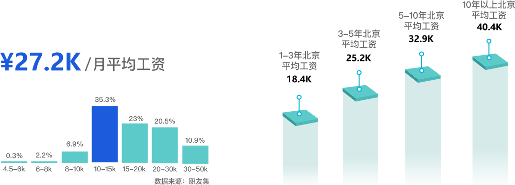 以北京地區(qū)為例,北京Java相關(guān)崗位均薪可達(dá)每月27.2K,隨著工作年限的增加,1-3年、3-5年、5-10年以及10年以上的薪資水平逐年遞增。