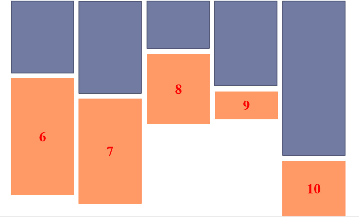 但這樣下去可能會(huì)導(dǎo)致每列之間的高度差距越來(lái)越大,并不符合實(shí)際瀑布流效果要求,在瀑布流中,從第六張圖片開(kāi)始,接下去的每一張圖片都應(yīng)該放在高度最低的那一列圖片下方。如下圖: