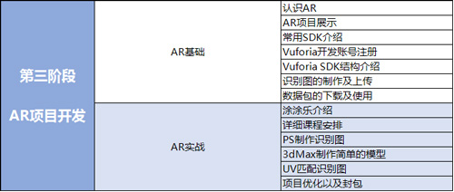 2、階段目標(biāo):熟悉市場(chǎng)上常用的AR SDK,明白市場(chǎng)需求,明確以后的就業(yè)方向;掌握增強(qiáng)現(xiàn)實(shí)企業(yè)級(jí)開(kāi)發(fā)流程