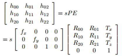 3 x 3 單應(yīng)矩陣 (由 DLT 計算) 可以寫成 3 x 4 相機投影矩陣 P (我們假設(shè)已知) 和 4 x 3 截斷extrinsics矩陣E的乘積。