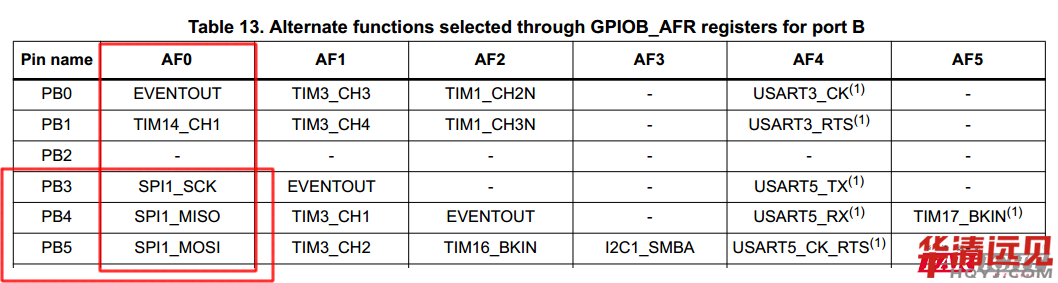 問題就來了!你咋知道我們所用的資源對應(yīng)的到時是哪一個GPIO_AF_x?比日說SPI1從函數(shù)說明來說可能是GPIO_AF_0也可能是GPIO_AF_1,這個咋玩呢??還是一句話,在參考手冊或者數(shù)據(jù)手冊Datasheet上找,肯定能找到。沒錯,就是在Datasheet上找到了!如下圖: