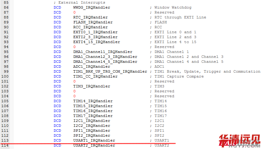 還記得前面提到的在啟動文件建立的中斷向量表嗎?打開startup_stm32f030.s文件,中斷向量表如下: