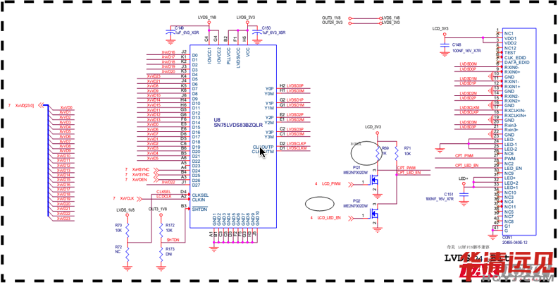 其實就是:把三星芯片輸出的TTL(RGB)信號轉(zhuǎn)換成LVDS差分信號輸出的LCD接收端。