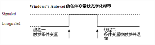 具體來說,Linux 平臺(tái)上 Pthread 下的條件變量狀態(tài)變化模型是這樣工作的:調(diào)用 pthread_cond_signal() 釋放被條件阻塞的線程時(shí),無論存不存在被阻塞的線程,條件都將被重新復(fù)位,下一個(gè)被條件阻塞的線程將不受影響。而對(duì)于 Windows,當(dāng)調(diào)用 SetEvent 觸發(fā) Auto-reset 的 Event 條件時(shí),如果沒有被條件阻塞的線程,那么條件將維持在觸發(fā)狀態(tài),直到有新的線程被條件阻塞并被釋放為止。