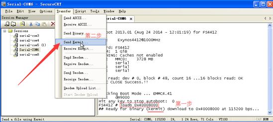 然后在串口工具上選擇transfer菜單里的send kermit選項