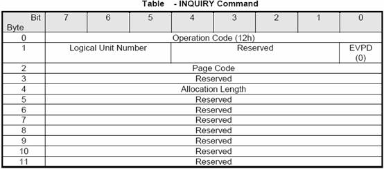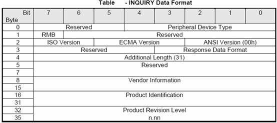 對于不同的命令,其命令塊描述符略有不同,其要求的返回內(nèi)容也有所不同,根據(jù)相 應的文檔,可以對每種請求作出適當?shù)幕貞�。比如,下面是INQUIRY 請求的命令塊描述符和其返回內(nèi)容的數(shù)據(jù)格式:如:INQUIRY