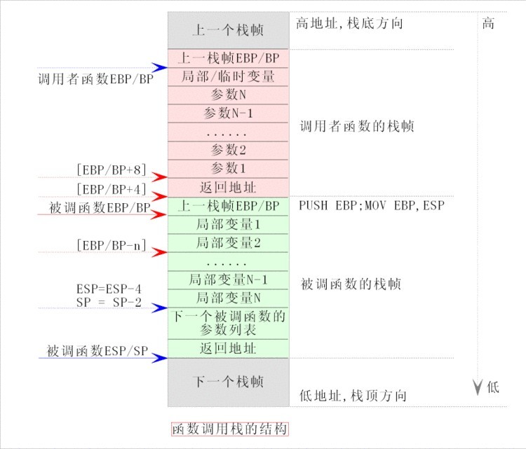 匯編/C語(yǔ)言中的'數(shù)據(jù)棧'跟數(shù)據(jù)結(jié)構(gòu)中的'邏輯棧'類似都是遵循先進(jìn)后出后進(jìn)先出原則,但是在實(shí)際操作過(guò)程中的基本單位不同: 1.在數(shù)據(jù)結(jié)構(gòu)中的'邏輯棧'按照使用者自己的需求定義大小及基本單位。例如可以存放10個(gè)char型,也可以存放20個(gè)結(jié)構(gòu)體等。 2.在匯編或C語(yǔ)言本身的'數(shù)據(jù)棧'中棧大小由編譯器指定,遵循FIFO規(guī)則的基本單位是棧幀,即每調(diào)用一個(gè)函數(shù)都會(huì)有一個(gè)新的棧幀加入,而函數(shù)返回則以棧幀為單位出棧。 棧幀也叫過(guò)程活動(dòng)記錄,是編譯器用來(lái)實(shí)現(xiàn)過(guò)程/函數(shù)調(diào)用的一種數(shù)據(jù)結(jié)構(gòu)。其實(shí)就是一個(gè)函數(shù)執(zhí)行的環(huán)境:函數(shù)參數(shù)、函數(shù)的局部變量、函數(shù)執(zhí)行完后返回到哪里等等。 因此,在同一個(gè)棧幀內(nèi)數(shù)據(jù)的訪問(wèn)可以使隨機(jī)的,匯編中可以通過(guò)ebp 指針向上或向下任意偏移就可以訪問(wèn)當(dāng)前函數(shù)內(nèi)部的所有局部變量,或向上偏移就可以訪問(wèn)調(diào)用者對(duì)當(dāng)前函數(shù)的傳參。(因?yàn)闂5脑鲩L(zhǎng)空間是從高地址到低地址。) 下面是函數(shù)調(diào)用過(guò)程中的操作: 當(dāng)發(fā)生函數(shù)調(diào)用的時(shí)候,�?臻g中存放的數(shù)據(jù)是這樣的: 1、調(diào)用者函數(shù)把被調(diào)函數(shù)所需要的參數(shù)按照與被調(diào)函數(shù)的形參順序相反的順序壓入棧中,即:從右向左依次把被調(diào)函數(shù)所需要的參數(shù)壓入棧; 2、調(diào)用者函數(shù)使用call指令調(diào)用被調(diào)函數(shù),并把call指令的下一條指令的地址當(dāng)成返回地址壓入棧中(這個(gè)壓棧操作隱含在call指令中); 3、在被調(diào)函數(shù)中,被調(diào)函數(shù)會(huì)先保存調(diào)用者函數(shù)的棧底地址(push ebp),然后再保存調(diào)用者函數(shù)的棧頂?shù)刂?即:當(dāng)前被調(diào)函數(shù)的棧底地址(mov ebp,esp); 4、在被調(diào)函數(shù)中,從ebp的位置處開始存放被調(diào)函數(shù)中的局部變量和臨時(shí)變量,并且這些變量的地址按照定義時(shí)的順序依次減小,即:這些變量的地址是按照棧的延伸方向排列的,先定義的變量先入棧,后定義的變量后入棧; 所以,發(fā)生函數(shù)調(diào)用時(shí),入棧的順序?yàn)?