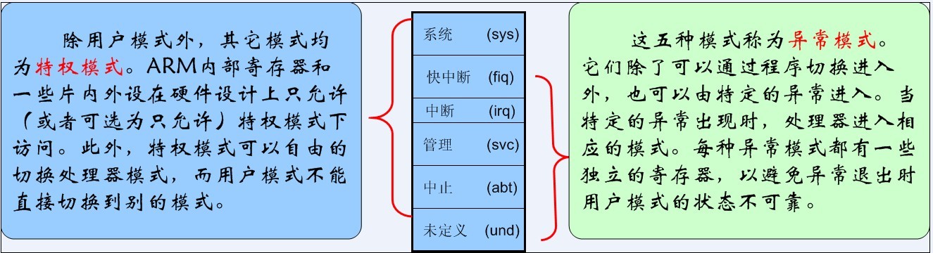 (1)系統(tǒng)(sys),快中斷(fiq)、中斷(irq)、管理(svc)、中止(abt)、未定義(und)這六種模式成為特權(quán)模式 (2)快中斷(fiq)、中斷(irq)、管理(svc)、中止(abt)、未定義(und) 這五種成為異常模式