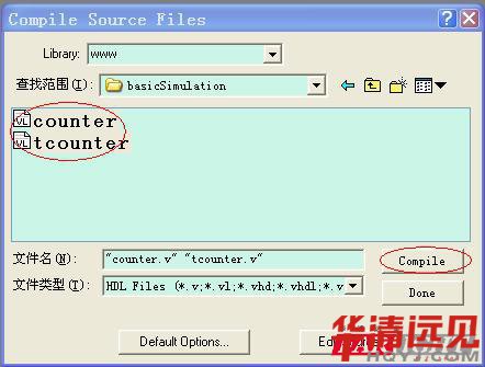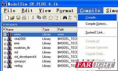 Work 是modelsim默認的庫,也可以改成自己有含義的名字, 也可以通過輸入命令建立庫 如在modelsim〉 vlib wwww回車,則建立了wwww庫 編譯文件 建立庫完成后,你該把你的設(shè)計文件在庫里面進行編譯,方法有菜單操作和命令輸入兩種菜單操作:在copile菜單下點compile選項,或 在modelsim〉下輸入 vcom ,回車。