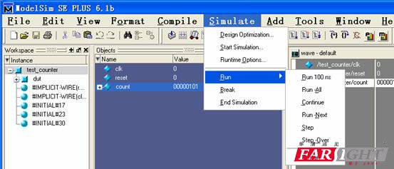 運行仿真 編譯完成后,喚醒testbench文件進行仿真,在菜單simulate菜單下點擊start simulate….按鈕或在命令行輸入Vsim命令,回車