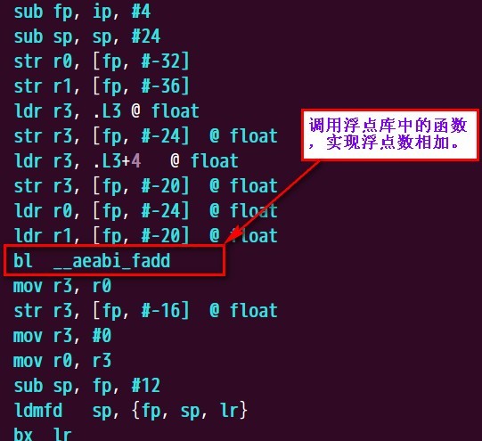 從圖中我們可以知道,默認(rèn)情況下,編譯器使用的是軟浮點,圖中__aeabi_fadd這個函數(shù)是在浮點庫中實現(xiàn)。如果想讓代碼能正常的運行,還需要在連接的時候靜態(tài)連接一下浮點庫。 在這里我們以一個完成的案例來說明一下,軟浮點庫的使用方法。 start.S: 使用硬件浮點實現(xiàn)浮點運算(hard-float) 使用硬件浮點的時候,我們需要給編譯器傳遞一些參數(shù),讓編譯器編譯出硬件浮點單元處理器能識別的指令。 (1)-mfpu=name 參數(shù)-mfpu就是用來指定要產(chǎn)生那種硬件浮點運算指令,常用的右vfp和neon等。 浮點協(xié)處理器指令: ARM10 and ARM9: (2) -mfloat-abi=value -mfloat-abi=soft 使用這個參數(shù)時,其將調(diào)用軟浮點庫(softfloat lib)來支持對浮點的運算,GCC編譯器已經(jīng)有這個庫了,一般在libgcc里面。這時根本不會使用任何浮點指令,而是采用常用的指令來模擬浮點運算。但使用的ARM芯片不支持硬浮點時,可以考慮使用這個參數(shù)。在使用這個參數(shù)時,連接時一般會出現(xiàn)下面的提示: undefined reference to `__aeabi_fdiv' 或者類似的提示,主要因為一般情況下連接器沒有去主動尋找軟浮點庫,這時使用將libgcc庫加入即可。 -mfloat-abi=softfp -mfloat-abi=hard 這兩個參數(shù)都用來產(chǎn)生硬浮點指令,至于產(chǎn)生哪里類型的硬浮點指令,需要由 -mfpu=xxx參數(shù)來指令。這兩個參數(shù)不同的地方是: -mfloat-abi=softfp生成的代碼采用兼容軟浮點調(diào)用接口(即使用-mfloat-abi=soft時的調(diào)用接口),這樣帶來的好處是:兼容性和靈活性。庫可以采用-mfloat-abi=soft編譯,而關(guān)鍵的應(yīng)用程序可以采用-mfloat-abi=softfp來編譯。特別是在庫由第三方發(fā)布的情況下。 -mfloat-abi=hard生成的代碼采用硬浮點(FPU)調(diào)用接口。這樣要求所有庫和應(yīng)用程序必須采用這同一個參數(shù)來編譯,否則連接時會出現(xiàn)接口不兼容錯誤。 我們對main.c文件使用硬件浮點重新編譯: