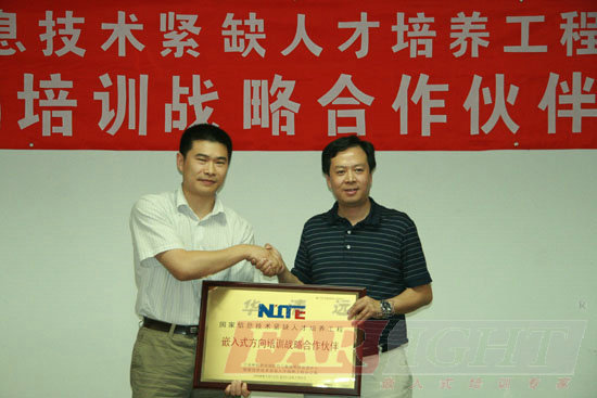 (圖一)左:華清遠見總裁季久峰, 右:CSIP副主任邱善勤博士 2009年7月31日,華清遠見嵌入式培訓中心與工業(yè)和信息化部軟件與集成電路促進中心(簡稱CSIP)簽署了合作協(xié)議,并舉行了隆重的合作伙伴授牌儀式。工業(yè)和信息化部軟件與集成電路促進中心副主任邱善勤博士、教育培訓部吳宏雷主任、華清遠見總裁季久峰及相關負責人出席了此次授牌儀式。自此,華清遠見正式成為信息技術緊缺人才培養(yǎng)工程(National Information Technology Education Project,簡稱NITE)培訓戰(zhàn)略合作伙伴。憑借多年在嵌入式專業(yè)領域內的卓越貢獻和權威地位,華清遠見也成為了首家獲NITE授權的嵌入式方向培訓機構。 信息技術緊缺人才培養(yǎng)工程(NITE)是由工業(yè)和信息化部直接指導,軟件與集成電路促進中心(CSIP)承擔并組織外眾多企業(yè)、研究機構和教育培訓機構,于2006年1月1日在全國范圍內啟動的緊缺人才培養(yǎng)項目,NITE定位于重點領域的緊缺人才培養(yǎng)。 NITE嵌入式培養(yǎng)是聯(lián)合中電網(wǎng)、清華大學等知名高等學府、多家著名電子技術提供商及華清遠見等專業(yè)培訓機構共同推出的首個級電子工程技術網(wǎng)上網(wǎng)下結合的培訓項目。該項目專門針對目前電子工程人才緊缺的現(xiàn)狀,旨在通過基礎理論學習與動手實踐相結合的方式,為電子工程技術人員提供系統(tǒng)學習前沿、熱門電子工程技術的機會。通過該培訓項目認證考試的工程師將獲得“信息技術應用技能證書”(電子工程與集成電路技術專業(yè))。