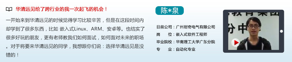 做技術(shù)支持工作以后,選擇轉(zhuǎn)行學(xué)嵌入式開發(fā)。告別萬元月薪工作,為了更多的發(fā)展從零開始學(xué)習(xí)。華清給你的不只知識(shí),還提高你的學(xué)習(xí)能力!