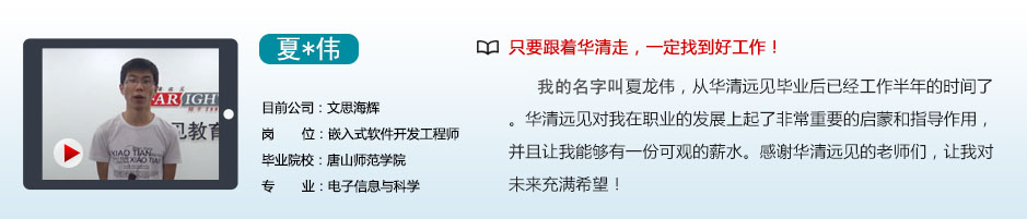 通過這四個(gè)月的學(xué)習(xí),學(xué)到的東西非常多。老師非常盡職盡責(zé),在后一段時(shí)間里接觸了幾個(gè)大的項(xiàng)目,嵌入式學(xué)習(xí)哪家強(qiáng),成都華清遠(yuǎn)見來幫忙。