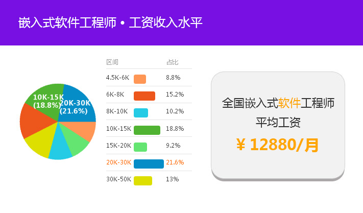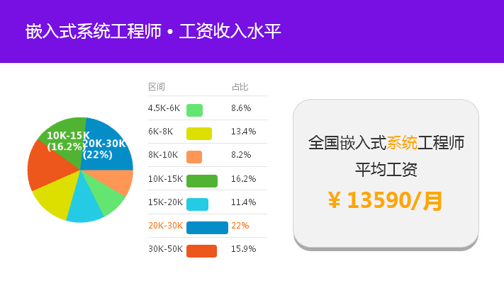 據(jù)統(tǒng)計(jì):目前全國(guó)嵌入式工程師平均薪資可達(dá)近13000元,其中薪資在20k-30k之間的占比有21.4%。而一線城市,如北京、上海、深圳等地,嵌入式工程師平均薪資更是高達(dá)16000元/月以上。由此可見(jiàn),不管是現(xiàn)在還是未來(lái),嵌入式工程師都會(huì)是企業(yè)發(fā)展不可或缺的一部分。