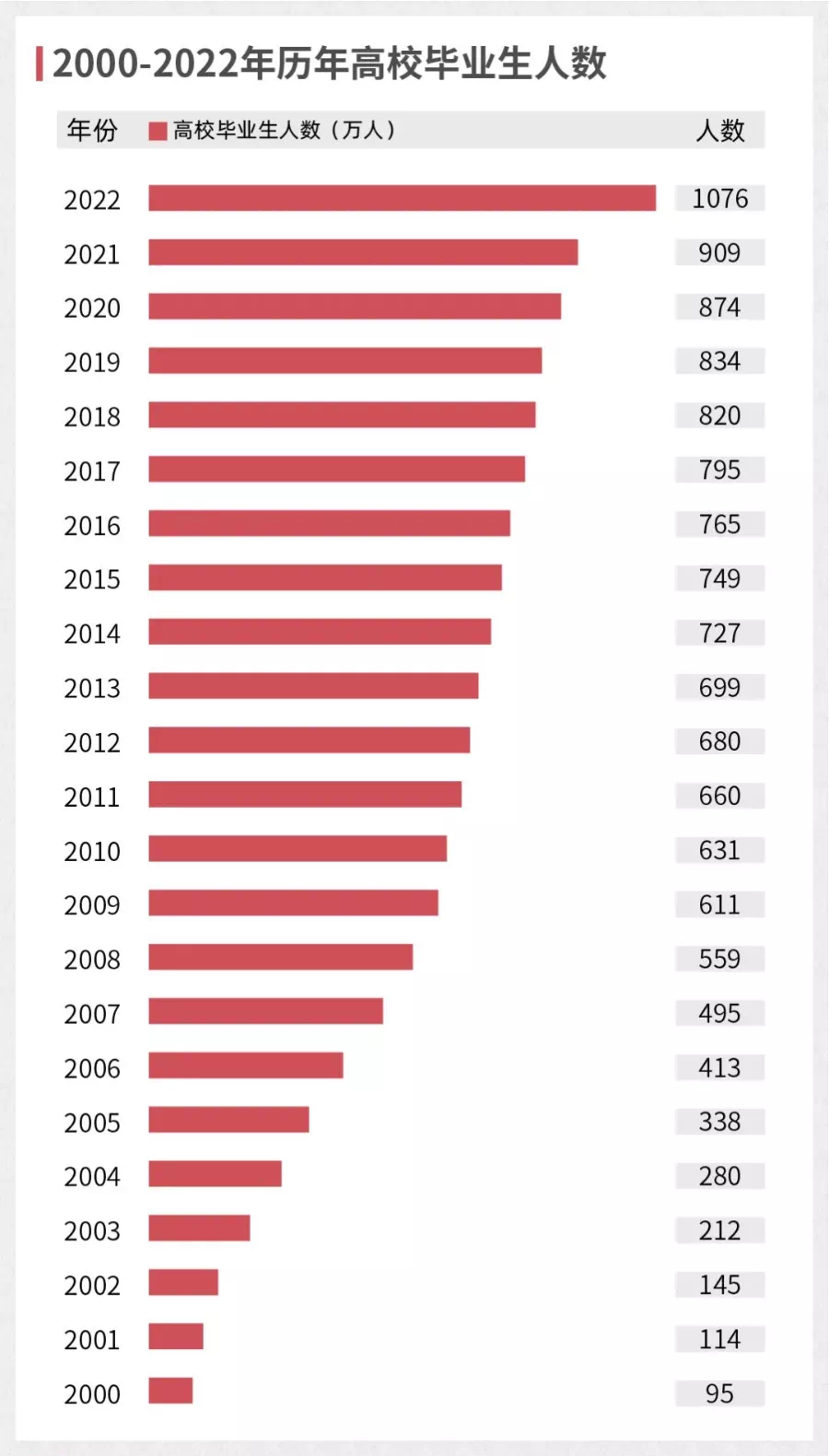 據(jù)教育部數(shù)據(jù)顯示,2022年高校畢業(yè)生規(guī)模為1076萬(wàn)人,同比增加167萬(wàn)人,規(guī)模和增量均創(chuàng)歷史新高。