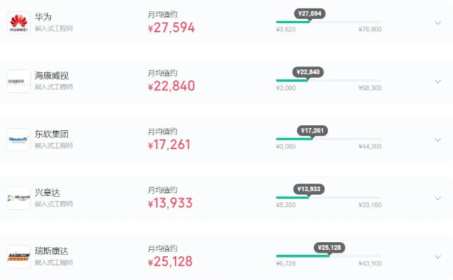 在一線大廠中,嵌入式相關(guān)崗位的薪資會更高。華為、�?低暤葮I(yè)內(nèi)知名大廠的嵌入式工程師薪資遠超其他行業(yè),其中華為嵌入式工程師月平均薪資高達27K,�?低曉缕骄劫Y可達22K。