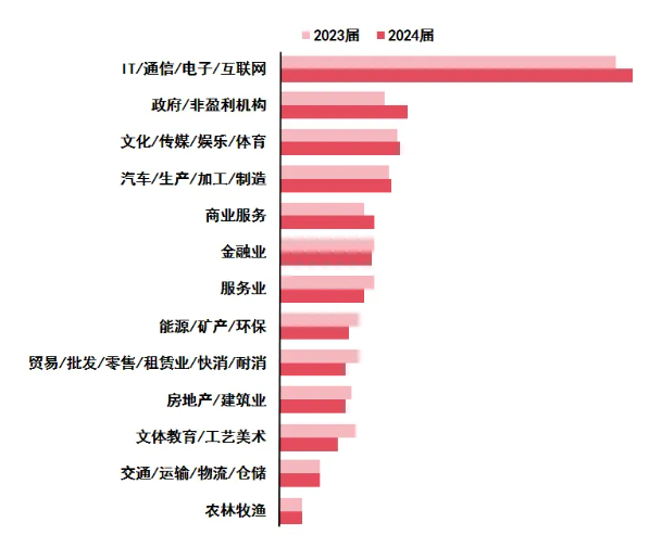 智聯(lián)招聘調(diào)研數(shù)據(jù)顯示,2024屆求職畢業(yè)生期望行業(yè)中,IT/通信/電子/互聯(lián)網(wǎng)、政府/非盈利機(jī)構(gòu)、文化/傳媒/娛樂(lè)/體育行業(yè)位列前三,占比分別為26.4%、9.4%、8.9%。