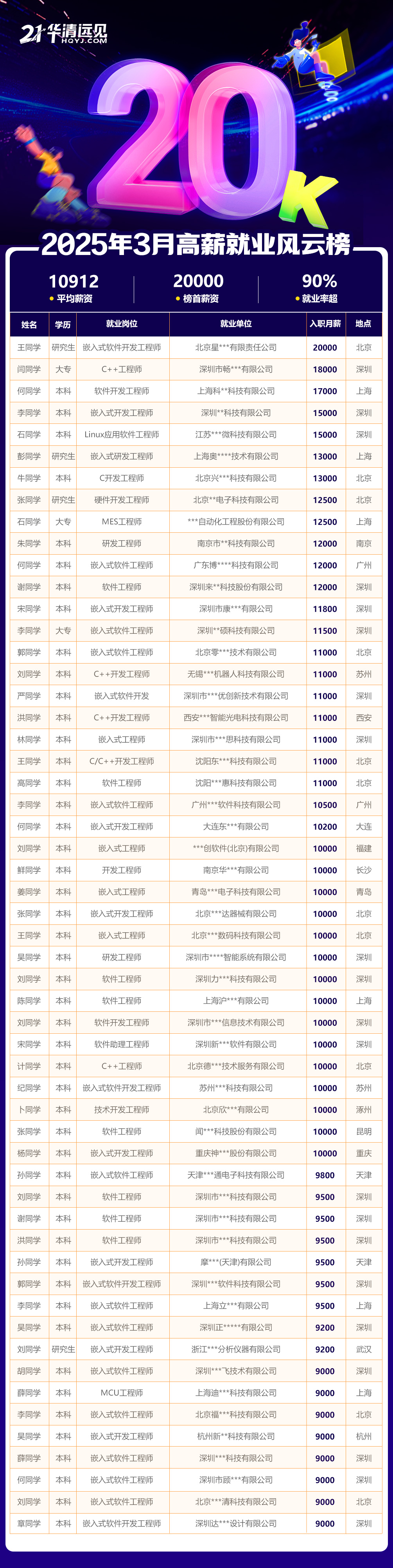 華清遠(yuǎn)見3月就業(yè)學(xué)員信息如下,最高薪20k,平均薪資在10.9k左右,就業(yè)率超90% 。
