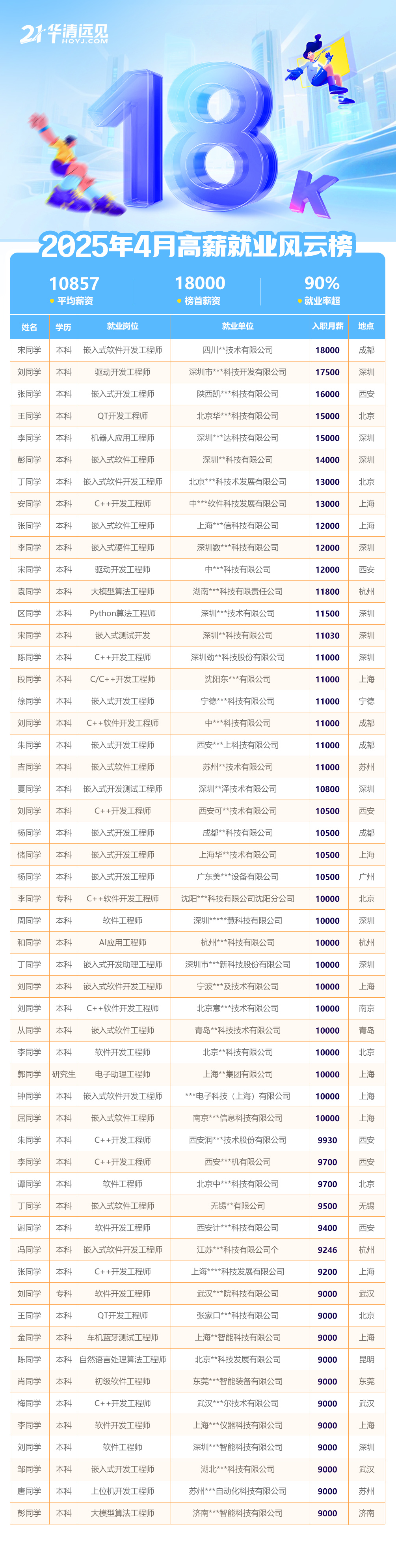 據(jù)獵聘統(tǒng)計(jì),嵌入式軟件工程師的平均薪資超17K,10K以上人數(shù)占比90.72%,其中15-30K的從業(yè)者居多,超50%!
