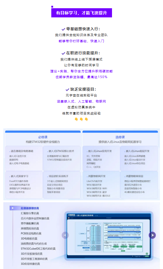 華清遠(yuǎn)見【嵌入式】非凡就業(yè)班能夠?yàn)榇蠹姨峁┣度胧饺珬<夹g(shù)課程、一流的線上學(xué)習(xí)平臺、近10款企業(yè)認(rèn)可的項(xiàng)目資源、筆試面試全方位模擬指導(dǎo)、不定期新老學(xué)員交流分享、企業(yè)直招宣講等等。