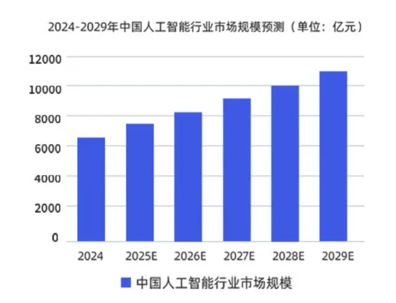 國家“十四五”政策大力支持人工智能行業(yè)發(fā)展,中國人工智能行業(yè)整體市場呈現(xiàn)高速增長趨勢。據(jù)測算,2029年市場規(guī)模將突破萬億大關(guān)。