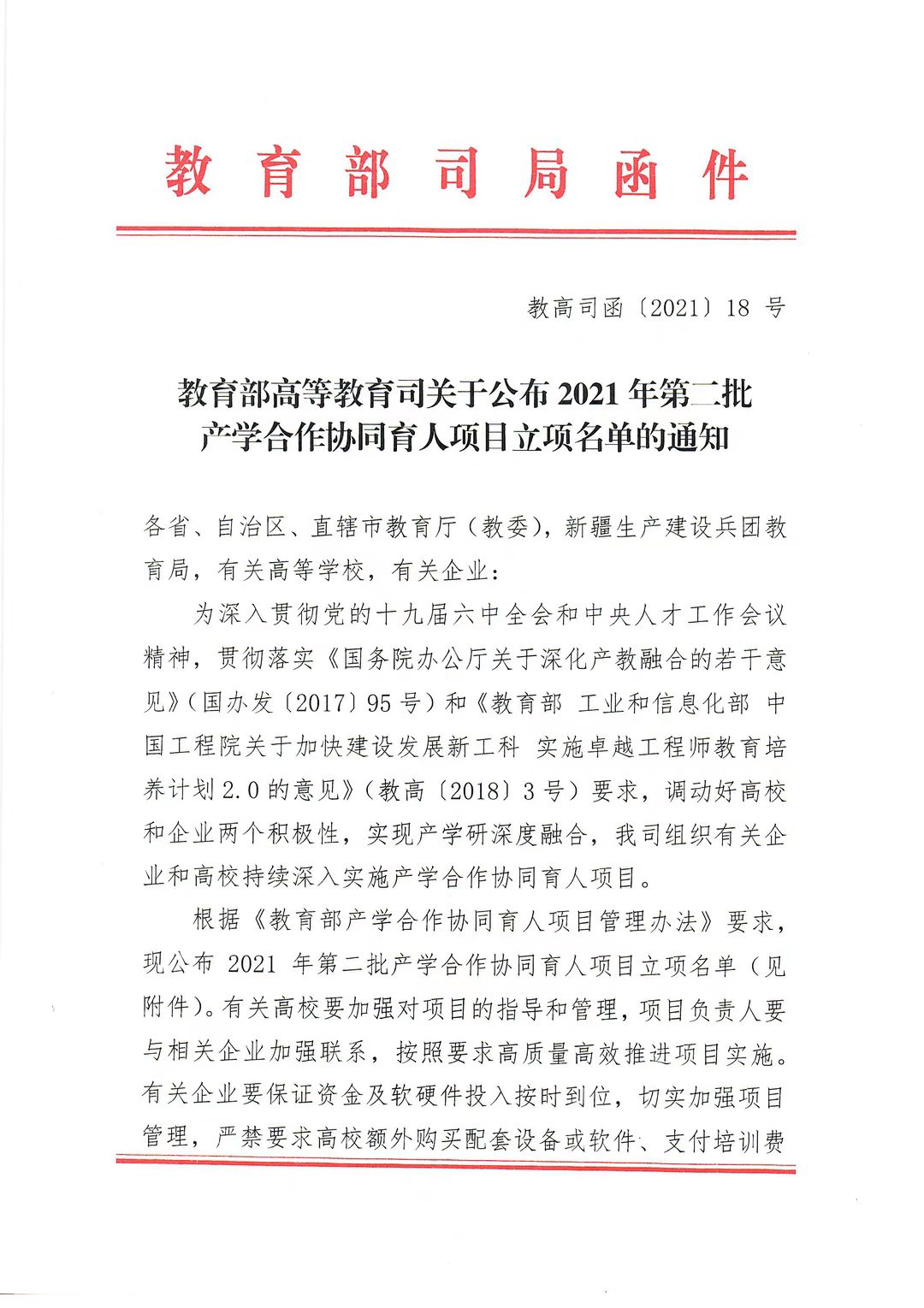為深入貫徹黨的十九屆六中全會(huì)和中央人才工作會(huì)議精神,貫徹落實(shí)《國(guó)務(wù)院辦公廳關(guān)于深化產(chǎn)教融合的若干意見(jiàn)》(國(guó)辦發(fā)〔2017〕95號(hào))和《教育部 工業(yè)和信息化部 中國(guó)工程院關(guān)于加快建設(shè)發(fā)展新工科 實(shí)施卓越工程師教育培養(yǎng)計(jì)劃2.0的意見(jiàn)》(教高〔2018〕3號(hào))要求,調(diào)動(dòng)好高校和企業(yè)兩個(gè)積極性,實(shí)現(xiàn)產(chǎn)學(xué)研深度融合,我司組織有關(guān)企業(yè)和高校持續(xù)深入實(shí)施產(chǎn)學(xué)合作協(xié)同育人項(xiàng)目。