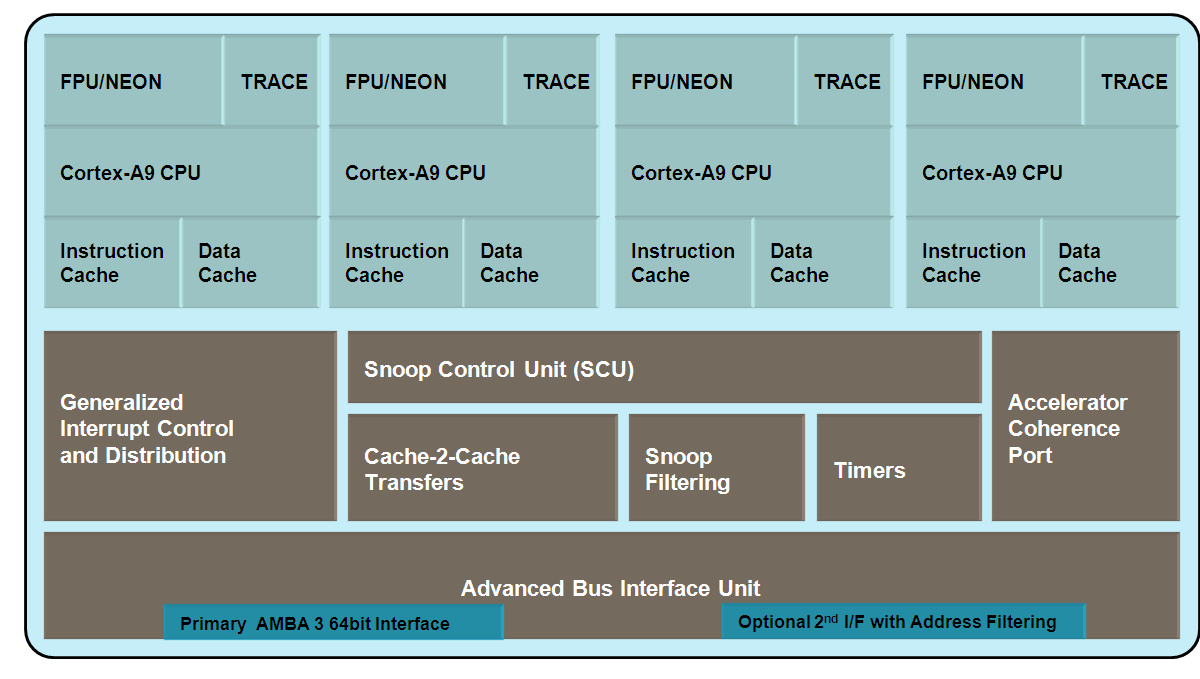 ARM Cortex-A9 MPCore 多核處理器集成了經(jīng)驗證非常成功的 ARM MPCore 技術(shù)以及更多增強(qiáng)功能,以此簡化了多核解決方案,并使其應(yīng)用范圍得到擴(kuò)展。Cortex-A9 MPCore 處理器可提供史無前例的可擴(kuò)展的高性能,同時還支持靈活設(shè)計和新功能,從而進(jìn)一步降低和控制處理器和系統(tǒng)級的能耗。借助 Cortex-A9 MPCore 處理器的定向?qū)崿F(xiàn),移動設(shè)備的高性能還可在現(xiàn)在的解決方案的基礎(chǔ)上不斷提高,具體方法是:利用設(shè)計靈活性和 ARM MPCore 技術(shù)提供的高級功率管理技術(shù),在散熱受限以及移動電源預(yù)算緊張的情況下維持運(yùn)行。使用可伸縮的高性能,該處理器可超過現(xiàn)今類似的高性能嵌入式設(shè)備的性能,并可在拓寬市場的基礎(chǔ)上進(jìn)行穩(wěn)定的軟件投資。