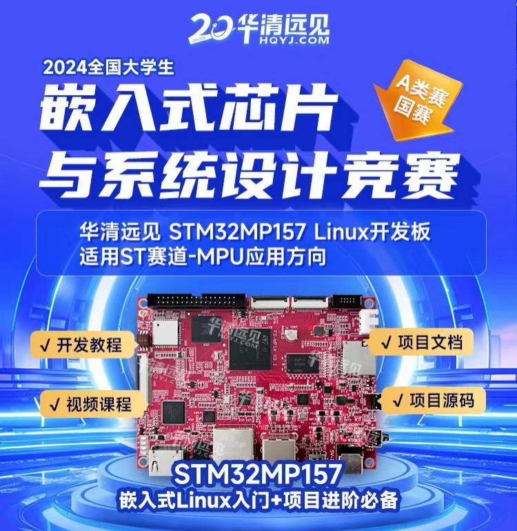 第七屆(2024)全國大學生嵌入式芯片與系統(tǒng)設計競賽(以下簡稱“大賽”)已經(jīng)拉開帷幕,大賽的報名熱潮正席卷而來。嵌入式大賽截至今年已連續(xù)舉辦七屆,作為教育部認可的全國普通高校大學生國家級A類賽事,也成為衡量高校大學生電子類專業(yè)技術(shù)實踐能力的重要指標之一。為了支持和保障嵌入式國際大賽ST賽道-MPU應用方向參賽者的作品質(zhì)量,華清遠見推出STM32MP157 Linux開發(fā)板及配套資源,為參賽者提供技術(shù)平臺支撐。