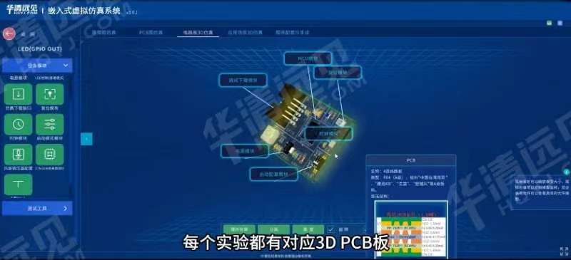 華清遠見嵌入式虛擬仿真系統(tǒng)以3D模型1:1還原了嵌入式硬件系統(tǒng)和豐富的傳感器、執(zhí)行器,模擬了真實的硬件和項目應(yīng)用場景,把多個硬件都放在仿真軟件里,脫離硬件去教學,能夠讓學生在無需實際硬件的情況下,通過模擬界面來學習并進行實驗。老師也能夠輕松引導(dǎo)學生探索不同硬件組件的功能與交互,并根據(jù)實際教學需求快速切換不同的硬件配置進行教學演示,降低硬件成本和管理復(fù)雜度的同時還提高了教學效率。