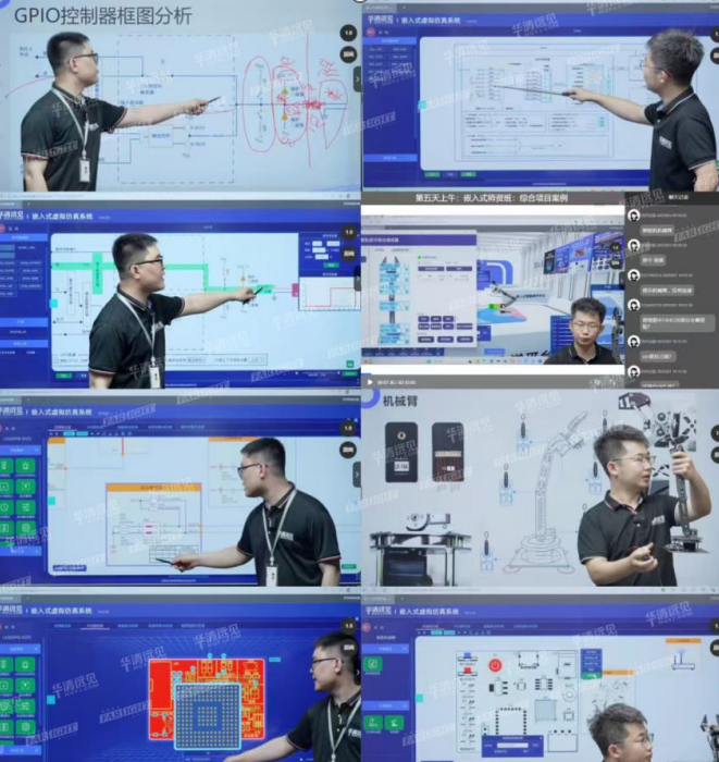 嵌入式技術(shù)是華清遠(yuǎn)見(jiàn)深耕多年的核心領(lǐng)域,元宇宙實(shí)驗(yàn)中心嵌入式虛擬仿真系統(tǒng)更是其在教學(xué)工具創(chuàng)新上的重要成果,代表了對(duì)嵌入式實(shí)踐教學(xué)方式的探索與突破。本次師資班的一大創(chuàng)新亮點(diǎn),便是全程依托該虛擬仿真系統(tǒng)開(kāi)展在線(xiàn)教學(xué)。針對(duì)嵌入式教學(xué)中芯片內(nèi)部結(jié)構(gòu)抽象、無(wú)法離開(kāi)硬件進(jìn)行教學(xué)、嵌入式Linux內(nèi)核調(diào)試難、系統(tǒng)化教學(xué)難的痛點(diǎn),系統(tǒng)通過(guò)3D可視化技術(shù),將芯片內(nèi)部結(jié)構(gòu)、電路連接、程序運(yùn)行過(guò)程轉(zhuǎn)化為直觀可交互的虛擬場(chǎng)景,新增的機(jī)械臂項(xiàng)目更是實(shí)現(xiàn)了從單一模塊到綜合系統(tǒng)的全鏈路仿真。這種創(chuàng)新模式徹底打破了傳統(tǒng)教學(xué)在設(shè)備、場(chǎng)地和成本上的限制,讓教師們得以同時(shí)在線(xiàn)完成原理圖設(shè)計(jì)、代碼調(diào)試等實(shí)操環(huán)節(jié),真正實(shí)現(xiàn) “邊學(xué)邊練”,有效降低了教學(xué)難度,提升了嵌入式教學(xué)的效率與體驗(yàn)。