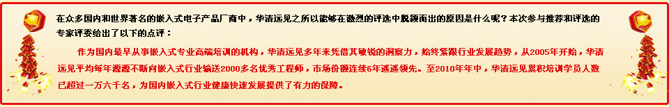 近日,“2010年度本土嵌入式系統(tǒng)十佳企業(yè)”名單正式對(duì)外公布,北京華清遠(yuǎn)見科技發(fā)展有限公司榮膺該獎(jiǎng)項(xiàng),并再次成為唯一獲得這一獎(jiǎng)項(xiàng)的培訓(xùn)機(jī)構(gòu),與華清遠(yuǎn)見同時(shí)獲得該榮譽(yù)的包括:廣州廣州致遠(yuǎn)電子有限公司(周立功公司)、上海海爾集成電路有限公司、北京合眾達(dá)等9家業(yè)內(nèi)知名企業(yè),這也是華清遠(yuǎn)見繼2008年度獲得此殊榮之后,在兩年一屆的評(píng)選活動(dòng)中再次獲得該榮譽(yù)。