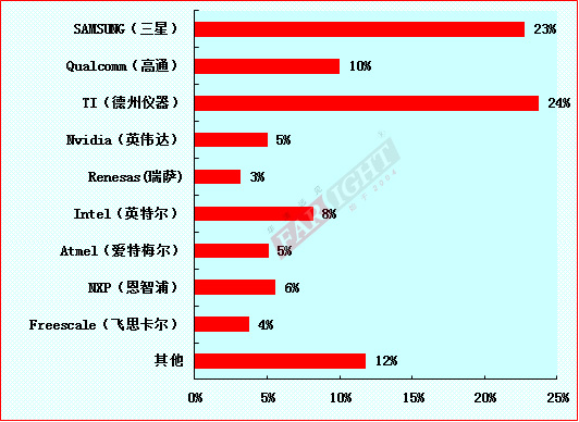 處理器芯片的選擇為本年度新增的調(diào)研項目,據(jù)調(diào)查統(tǒng)計數(shù)據(jù)的結(jié)果顯示,TI(德州儀器)和SAMSUNG(三星),成為受開發(fā)者歡迎的嵌入式處理器芯片提供商,占據(jù)了接近一半(47%)的市場份額,其他知名廠家處理器芯片所占市場份額分布為:Qualcomm(高通)10%、Intel(英特爾)8%、NXP(恩智浦)6%、Atmel(愛特梅爾)5%、Nvidia(英偉達)5%、Freescale(飛思卡爾)4%、Renesas(瑞薩)3%,除以上廠家之外的其他處理器則占總體市場份額的12%。