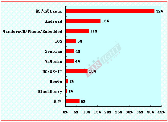 在本年度新增調(diào)研項(xiàng)目中新增了對(duì)未來1-2年內(nèi)嵌入式行業(yè)會(huì)占主導(dǎo)地位的嵌入式操作系統(tǒng)的調(diào)查,調(diào)查統(tǒng)計(jì)數(shù)據(jù)顯示,嵌入式Linux仍然是未來幾年內(nèi),嵌入式工程師認(rèn)可的具發(fā)展?jié)摿Φ氖走x嵌入式操作系統(tǒng),所占比例接近一半(47%),而Android智能手機(jī)操作系統(tǒng),也受到了越來越多嵌入式工程師的關(guān)注,并對(duì)其在移動(dòng)手機(jī)操作系統(tǒng)中廣闊的發(fā)展空間及發(fā)展?jié)摿Τ錆M了期待。由此可見,作為開源系列的兩款優(yōu)秀的嵌入式操作系統(tǒng)(嵌入式Linux及Android),其開源的特性,無疑使其在市場(chǎng)競(jìng)爭(zhēng)中,具備了強(qiáng)大的競(jìng)爭(zhēng)優(yōu)勢(shì)及用戶基礎(chǔ),用戶就是王道。
