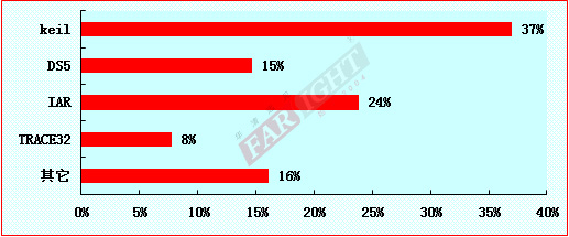 軟件開發(fā)調(diào)試工具的選擇為本年度新增調(diào)研項目,調(diào)查統(tǒng)計的數(shù)據(jù)結(jié)果顯示,keil和IAR分別以37%、24%的比例成為嵌入式開發(fā)者的主要調(diào)試工具,總計占所有參與調(diào)研人數(shù)的61%。合適的調(diào)試工具的選擇使用,可以大大加快產(chǎn)品的開發(fā)進度。這也使得在調(diào)試工具層面的技術(shù)支持和發(fā)展成為研發(fā)過程中需要考慮的因素之一。同時,這個調(diào)查結(jié)果也為初學者如何選擇開發(fā)工具提供有價值的參考。