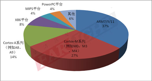 從2013-2014年度的調查統計數據中可以看到, ARM處理器(包括ARM7/9/11、Cortex-M系列、Cortex-A系列)毫無疑問地占據了嵌入式處理器絕大部分的市場份額(78%),在ARM及其合作伙伴的市場推動下,ARM7/9/11較前一年的統計結果,出現了連續(xù)的下滑,市場份額下降了4個百分點,而新的定位高端的ARM-A系列、定位低端的ARM-M系列則有一定程度的增長,已毋庸置疑地成為ARM處理器應用的主流。隨著物聯網產業(yè)的快速發(fā)展,對低功耗微控制器的需求必然會更進一步地推動Cortex-M系列處理器的快速應用,而高性能智能手機、平板電腦及更多智能終端設備的開速普及則使得Cortex-A系列處理器獲得了快速發(fā)展的機會。