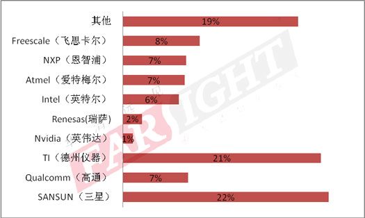 據調查統計數據的結果顯示,TI(德州儀器)和SAMSUNG(三星),成為受開發(fā)者歡迎的嵌入式處理器芯片提供商,占據了接近一半(43%)的市場份額,其他知名廠家處理器芯片所占市場份額分布為:Freescale(飛思卡爾)8%、Qualcomm(高通)7%、NXP(恩智浦)7%、Atmel(愛特梅爾)7%、Intel(英特爾)6%、Renesas(瑞薩)2%、Nvidia、(英偉達)1%、,除以上廠家之外的其他處理器則占總體市場份額的19%。值得一提的是Freescale(飛思卡爾)的芯片占比例今年有大幅度提升。