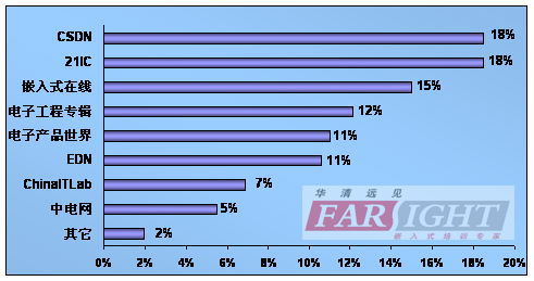 由圖表中??以看出, 在嵌入式工程師經(jīng)常關(guān)顧的網(wǎng)站??,CSDN??21IC所占的比例大,均為18%,而嵌入式在線、電子工程專輯、電子產(chǎn)品世界、EDN、IT實驗室所占比例均??10%左右??