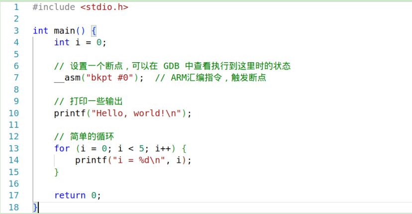 l 設(shè)置斷點:可以設(shè)置斷點在 main 函數(shù)或任何其他地方(例如,剛剛插入的 __asm("bkpt #0"))。