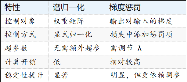 在實(shí)際中,兩者結(jié)合使用可以取長補(bǔ)短。譜歸一化控制網(wǎng)絡(luò)整體尺度,而梯度懲罰則精 細(xì)約束輸入輸出的敏感度。