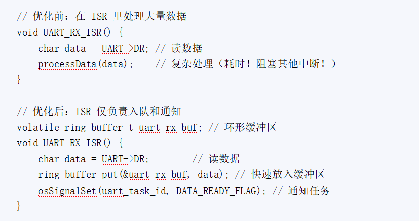 l 問題:中斷處理函數(shù) (ISR) 太長,耽誤其他中斷或主程序運(yùn)行;頻繁小數(shù)據(jù)中斷導(dǎo)致 CPU 疲于奔命。