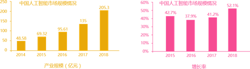 隨著人工智能技術(shù)的逐漸成熟,科技、制造業(yè)等業(yè)界巨頭不斷深入布局。數(shù)據(jù)顯示,2018年中國(guó)人工智能市場(chǎng)規(guī)模約為205億元,增長(zhǎng)率達(dá)到52.1%。