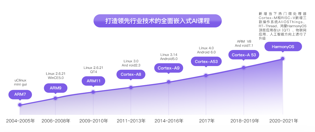 第四代課程在原有Cortex-A、Cortex-M的基礎(chǔ)上新增了RISC-V微處理器。得以實(shí)現(xiàn)更多的實(shí)戰(zhàn)項(xiàng)目處理,填補(bǔ)了市場(chǎng)上這一處理器學(xué)習(xí)的空白。