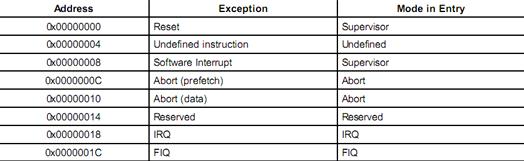 d.跳入異常向量表:強(qiáng)制設(shè)置PC的值為相應(yīng)異常向量地址,跳轉(zhuǎn)到異常處理程序中。