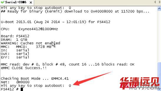 確認地址后,我們使用 《超級終端》 或《SecureCRT》 等支持 kermit傳輸協(xié)議的串口通信工具打開與開發(fā)板的串口連接。開啟開發(fā)板電源讓u-BOOT啟動運行,在啟動倒數(shù)到0前,按任意鍵停止系統(tǒng)引導(dǎo)。