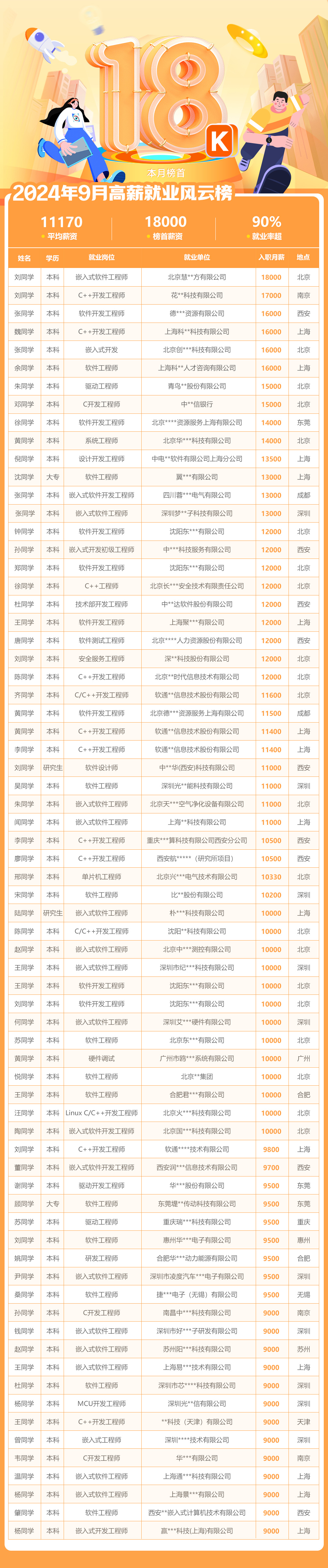為了讓大家深入了解嵌入式及相關崗位的薪資情況,華妹給大家直觀地展示一下華清遠見2024年9月高薪就業(yè)學員的信息,平均薪資1W+,最高薪資18000,就業(yè)率超90%。