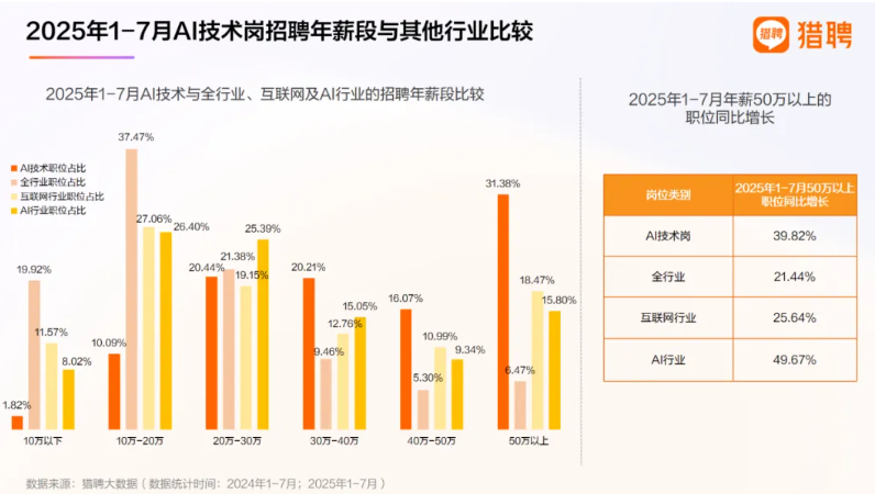 獵聘大數(shù)據(jù)研究院發(fā)布的《AI科技人才發(fā)展報(bào)告》顯示,AI技術(shù)崗位中算法工程師需求占比達(dá)67.17%,50萬年薪以上職位占比超30%。