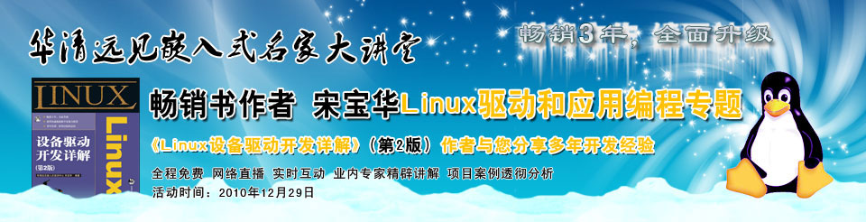 | 2010年11月,由華清遠見嵌入式培訓中心資深講師宋寶華老師編寫、人民郵電出版社出版發(fā)行的《Linux設備驅(qū)動開發(fā)詳解(第2版)》正式在出版上市。該書的第一版曾經(jīng)創(chuàng)下當年度IT圖書風云榜 “十大暢銷經(jīng)典”,“十佳原創(chuàng)”,暢銷榜OS類第1的驕人業(yè)績,并榮獲51CTO網(wǎng)站主辦的2009年度佳技術圖書獎,ZD.NET技術網(wǎng)站主辦的2009年度十佳IT圖書之一,同時被china-pub評選進入2009年度技術圖書暢銷榜TOP50,曾創(chuàng)下首版狂銷達3萬冊的驕人紀錄,從讀者好評如潮的反饋來看,該書早已成為Linux驅(qū)動開發(fā)領域內(nèi)的經(jīng)典圖書。而這次新升級的《Linux設備驅(qū)動開發(fā)詳解》不僅很好地延續(xù)了上一版經(jīng)典圖書的風格,同時也基于新Linux內(nèi)核和LDD6410平臺進行了講解內(nèi)容和案例的全面升級和更新,書中匯聚的大量Linux驅(qū)動開發(fā)的參考代碼和技術資料,相信對廣大的Linux開發(fā)人員和嵌入式工程師都具有非常重要的價值和意義。(華清遠見精品圖書展示區(qū)>>) 近日,為了讓更多嵌入式技術愛好者能夠獲得與宋寶華老師直接進行技術交流的機會,華清遠見專門在業(yè)內(nèi)知名的嵌入式開發(fā)名家大講堂中安排了Linux內(nèi)核及驅(qū)動開發(fā)專題技術講座,該講座采用網(wǎng)絡直播方式,由宋寶華老師親自擔綱主講,結(jié)合多年項目開發(fā)經(jīng)驗,分享linux內(nèi)核以及驅(qū)動開發(fā)中的關鍵技術點,為大家打造一個無地域界限、實時互動的專業(yè)技術交流平臺,從而幫助廣大的朋友真正實現(xiàn)近距離、實時與業(yè)內(nèi)頂尖高手相互過招、共同切磋的機會! |