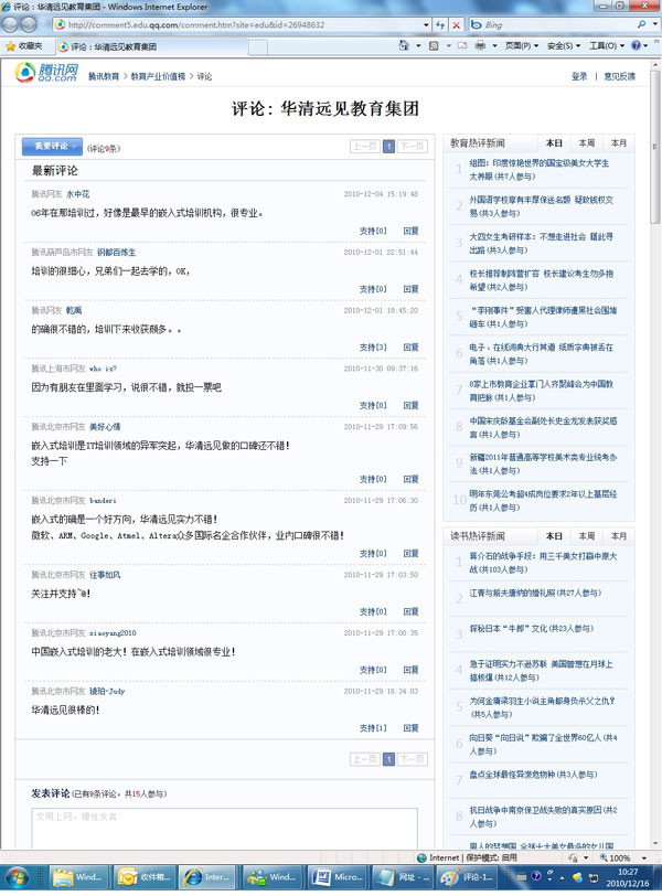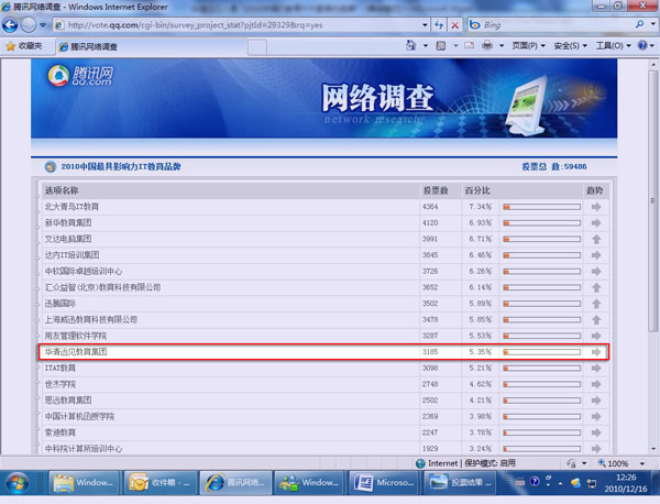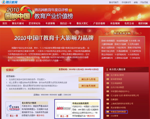 本次騰訊網(wǎng)教育頻道“2010回響教育年度總評榜”入圍名單的終產(chǎn)生,是在2010.11.15-2010.12.05長達(dá)1個多月的時間內(nèi),由廣大的網(wǎng)友投票而上榜,在整個活動舉辦過程中,主辦方對整個投票的過程進(jìn)行了嚴(yán)格的監(jiān)督,而這種方式也更加凸顯出本次評選活動的公正性,華清遠(yuǎn)見終以3185票,占總票數(shù)的5.35%而上榜。