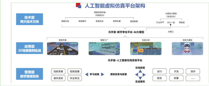 人工智能高端人才實(shí)戰(zhàn)班還使用了華清遠(yuǎn)見自研教學(xué)平臺(tái)——人工智能虛擬仿真平臺(tái)。人工智能虛擬仿真平臺(tái)是華清遠(yuǎn)見為解決多年的人工智能學(xué)科建設(shè)及人才培養(yǎng)的過程中幾大難點(diǎn)問題應(yīng)運(yùn)而生的軟件教學(xué)平臺(tái)。獨(dú)家首創(chuàng)的積木式搭建人工智能學(xué)習(xí)架構(gòu),可視化理解人工智能算法,配以專業(yè)課程、實(shí)踐項(xiàng)目、動(dòng)態(tài)代碼資源包和可以遷移學(xué)習(xí)的3D產(chǎn)業(yè)場(chǎng)景,能夠快速準(zhǔn)確幫助學(xué)生構(gòu)建整體人工智能學(xué)習(xí)思維并可進(jìn)行自主學(xué)習(xí)和創(chuàng)新實(shí)驗(yàn)和成果展示。